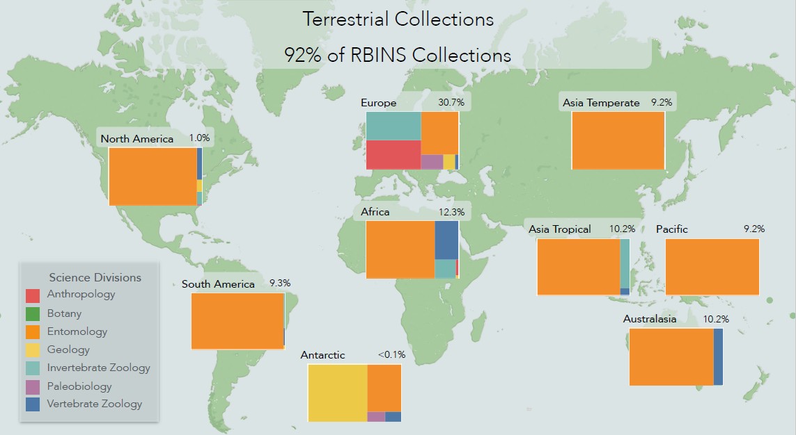 92 % of the RBINS collections are originated from terrestrial environments (including paleontological sites of marine ecosystems)