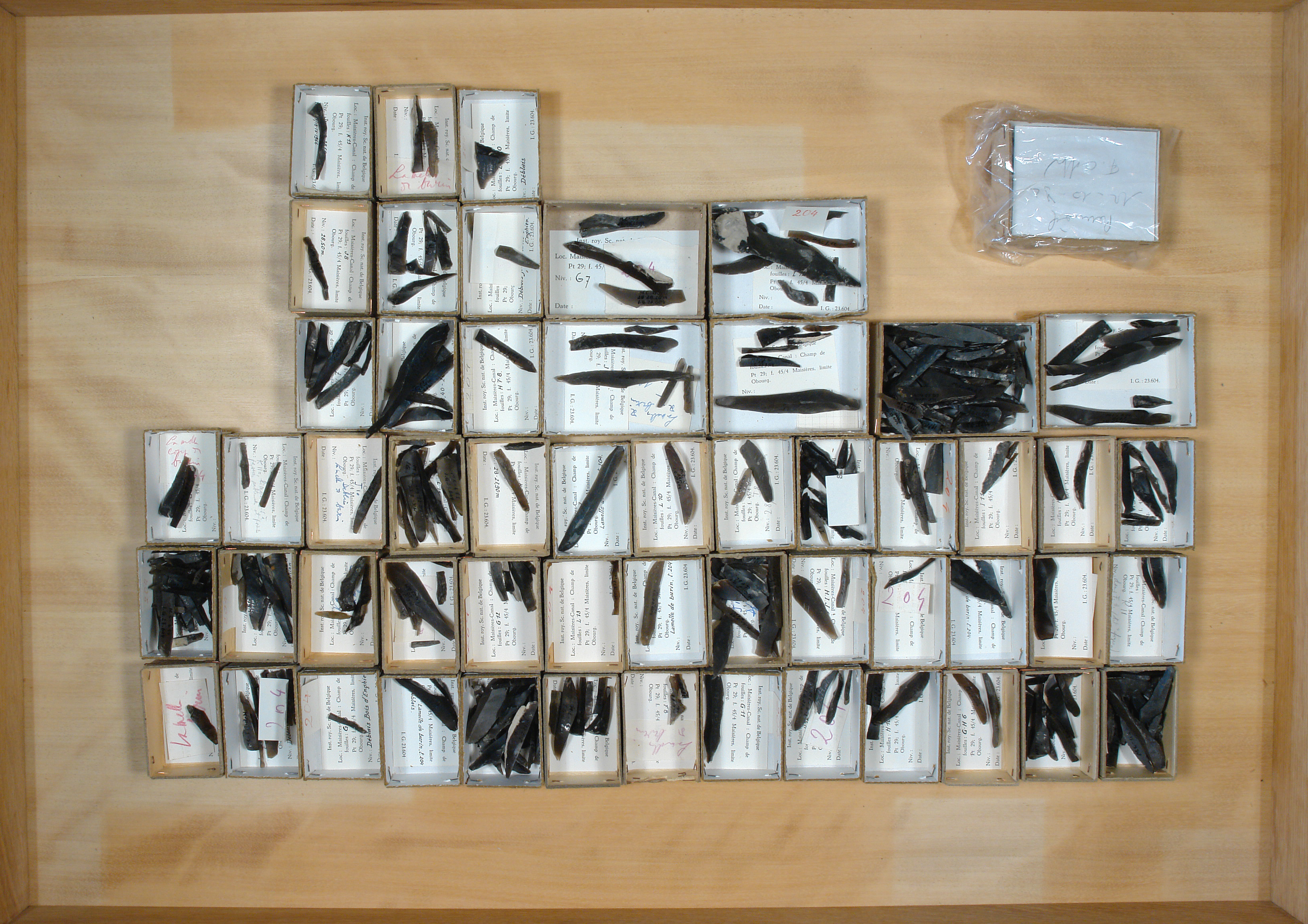 Champ de fouilles, T. 204 - lamelles de burin: 55 cuvettes. Pces lithiques