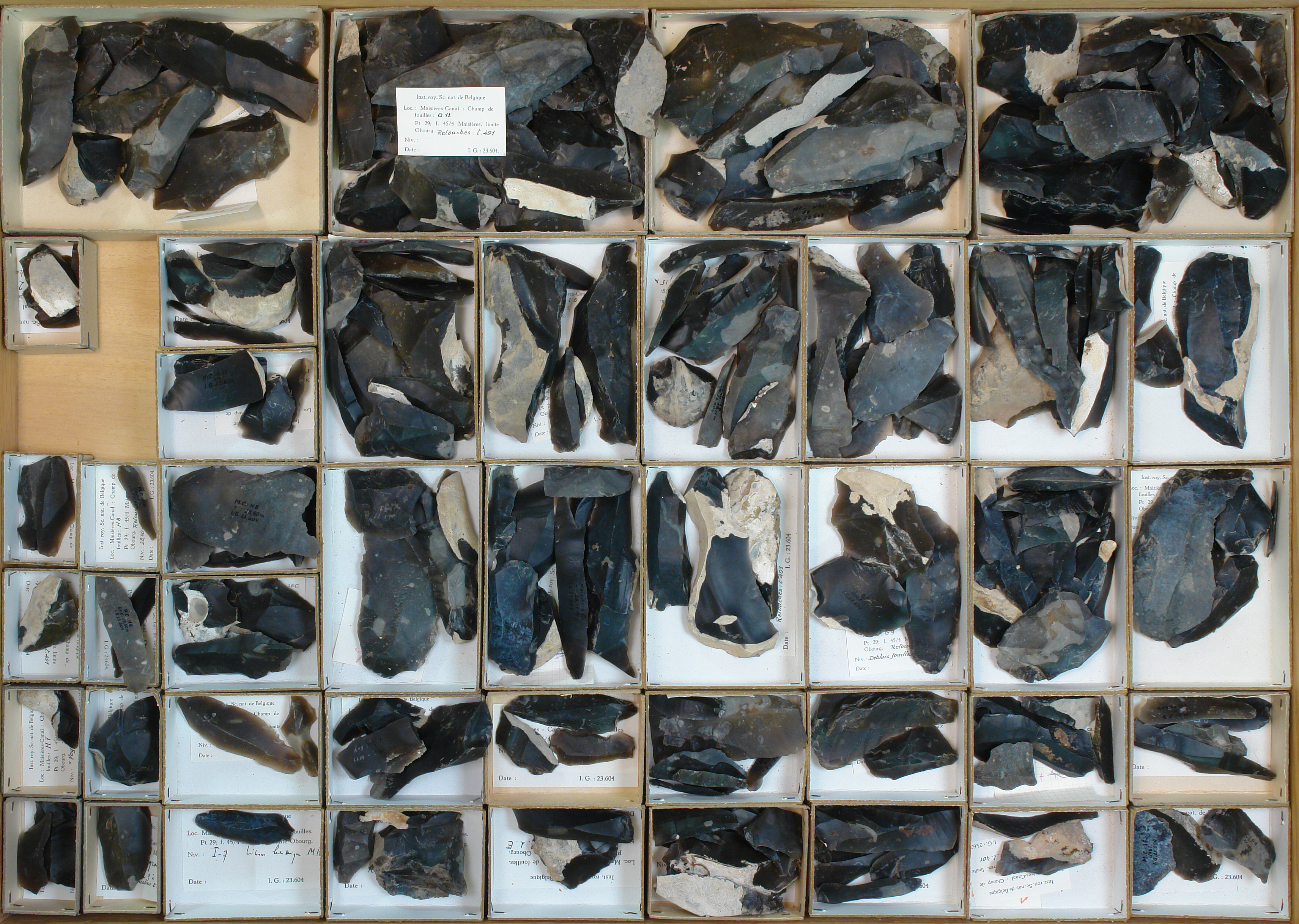 Champ de fouilles, T. 401 E.F.G.H. - retouches: 42 cuvettes. Pces retouchées