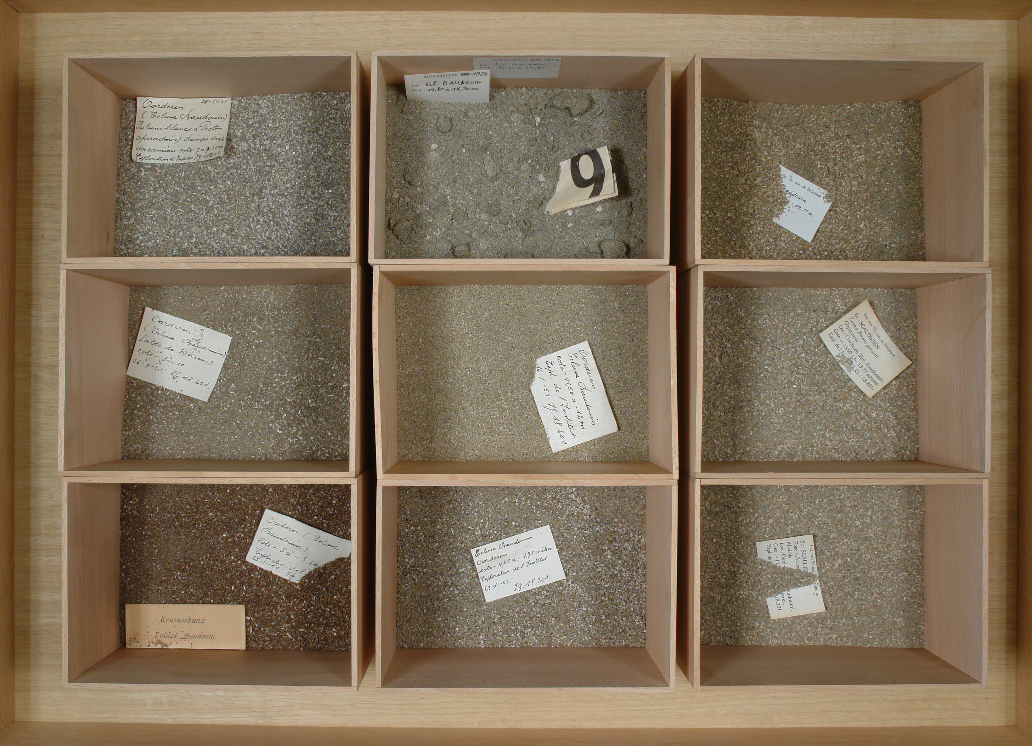 Kruisschans (Ecluse Baudouin) - échantillons lithologiques: 9 cuvettes en bois.