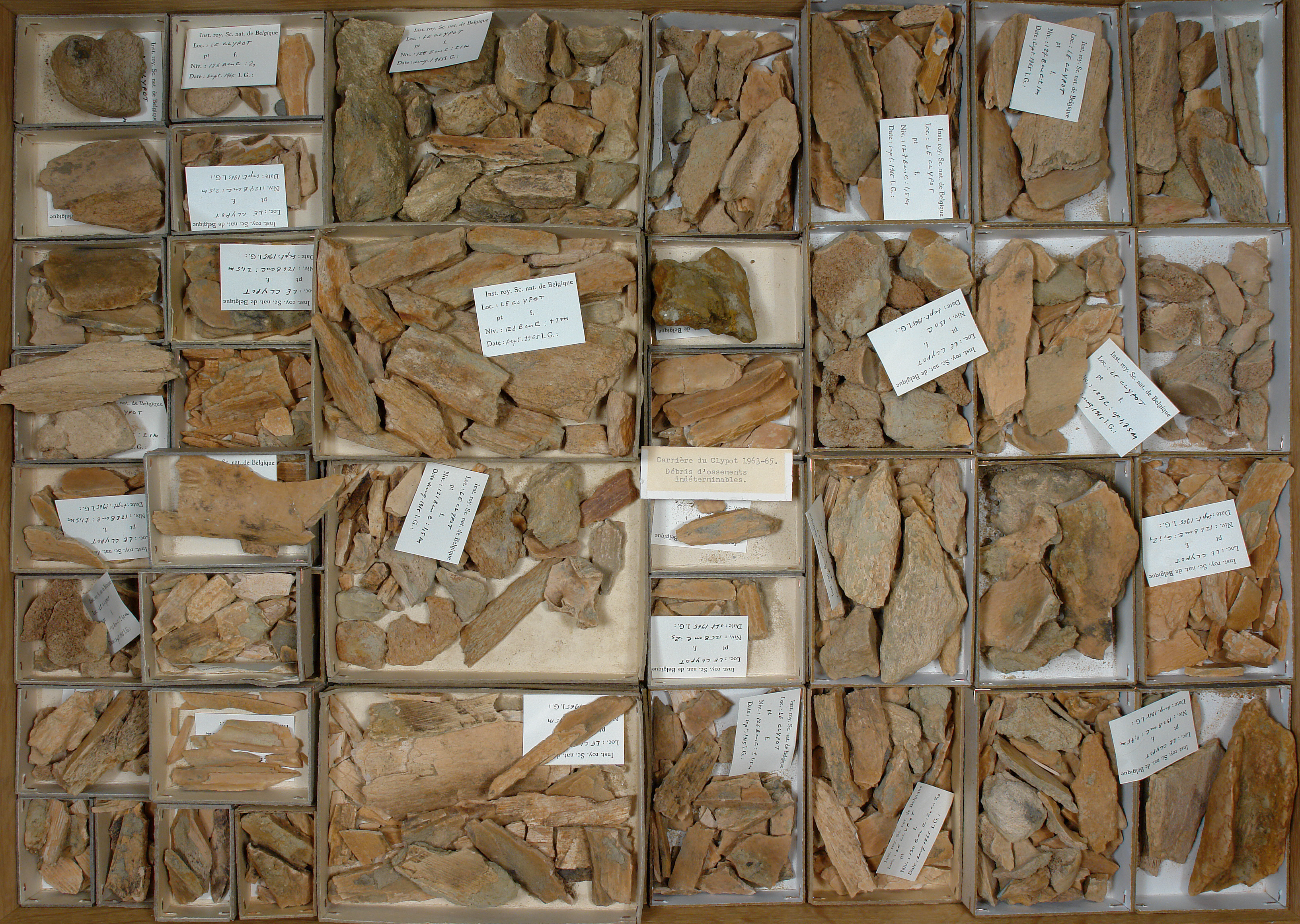 Débris d'ossements indéterminés - fragments d'os divers: 58 cuvettes.