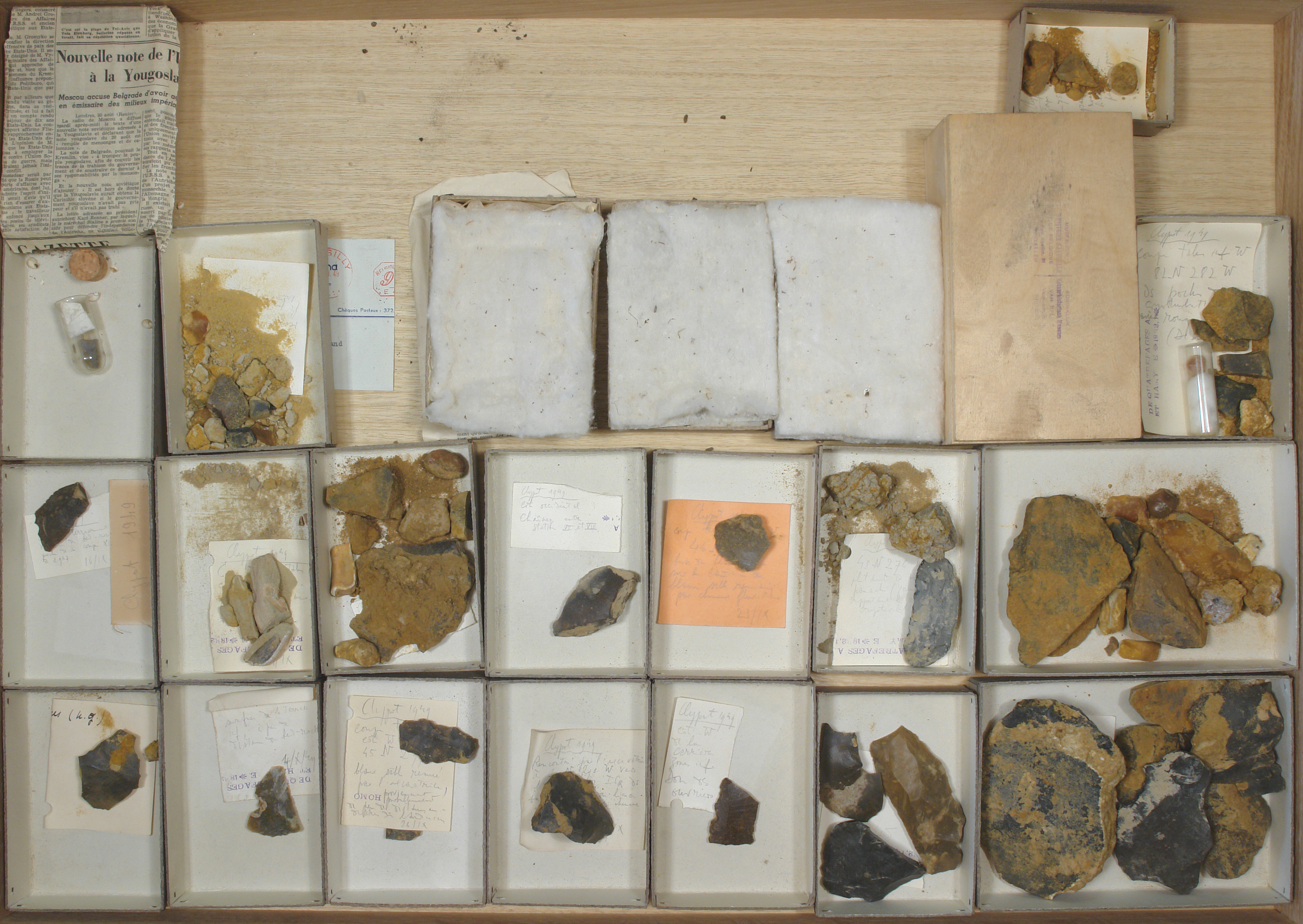 Clypot 1949 - coquillages: 5 cuvettes, - échant. litho. + cailloutis: 16 cuvettes.