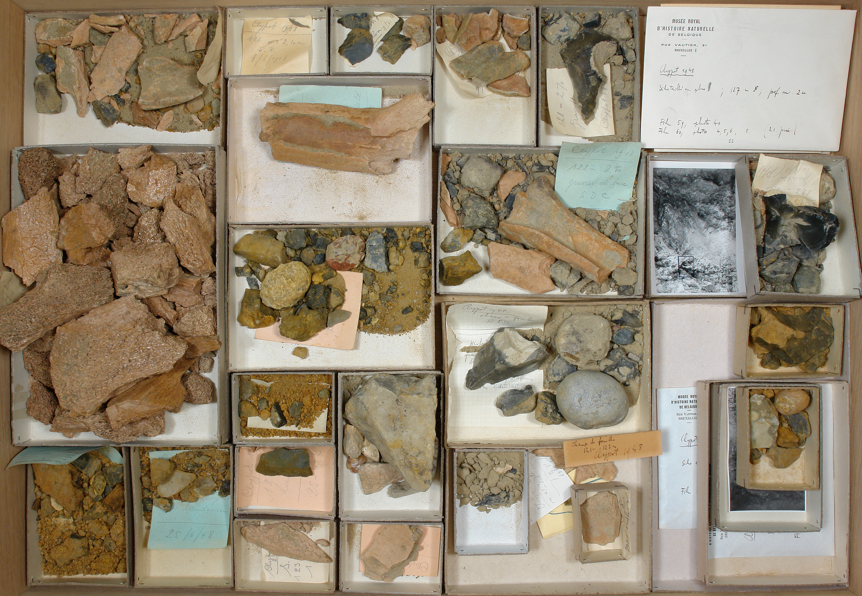 Champ de fouilles 121-123 (1948) - échant. litho. + oss. + cailloutis: 24 cuvettes. - enveloppes + photos: 8 pcs.