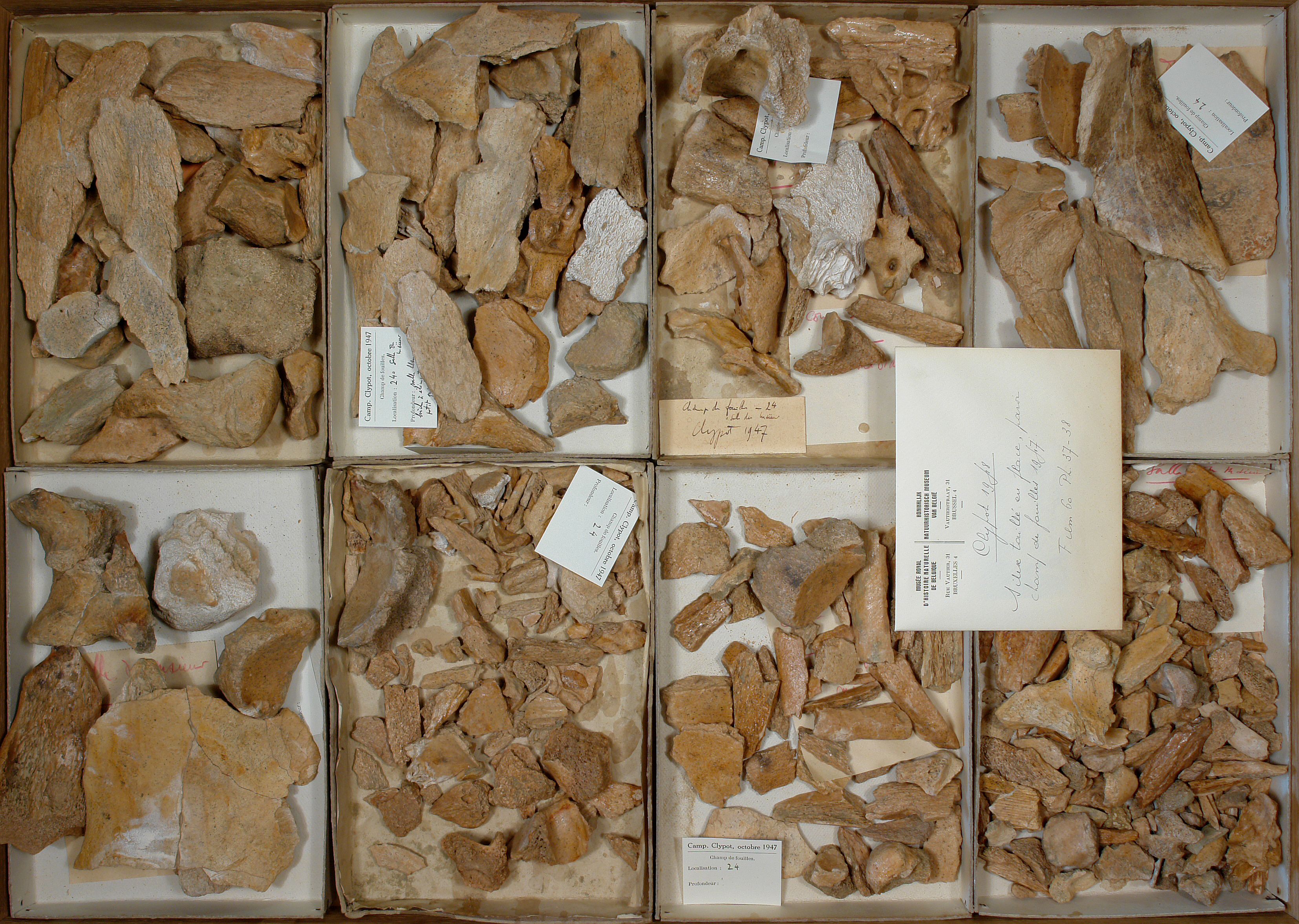 Champ de fouille - enveloppe avec photos: 1 pce, - ossements: 7 cuvettes.