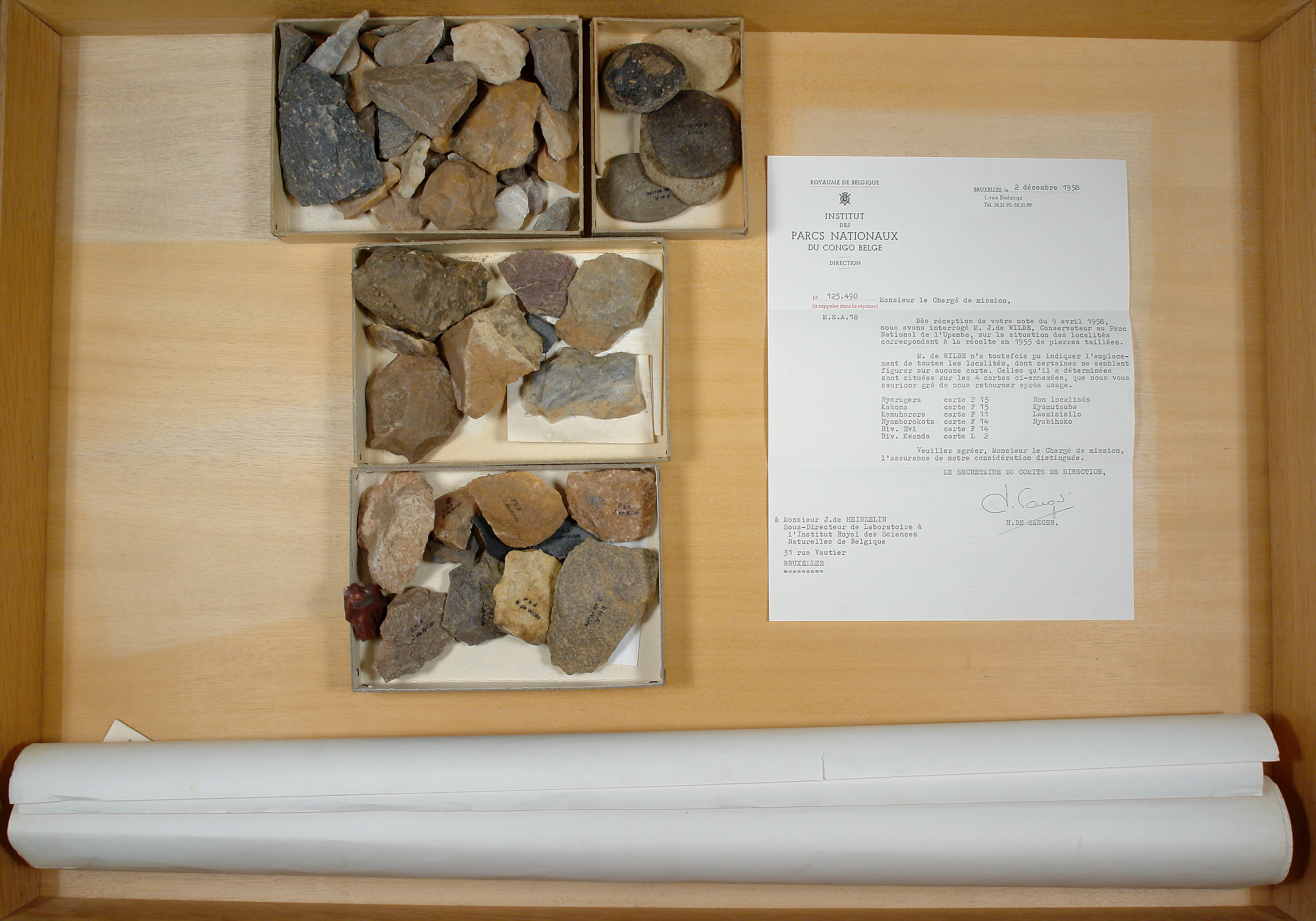 PNA. Récoltes J. de Wilde - silex divers: 4 cuvettes, - cartes: 2 pcs + 1 lettre.