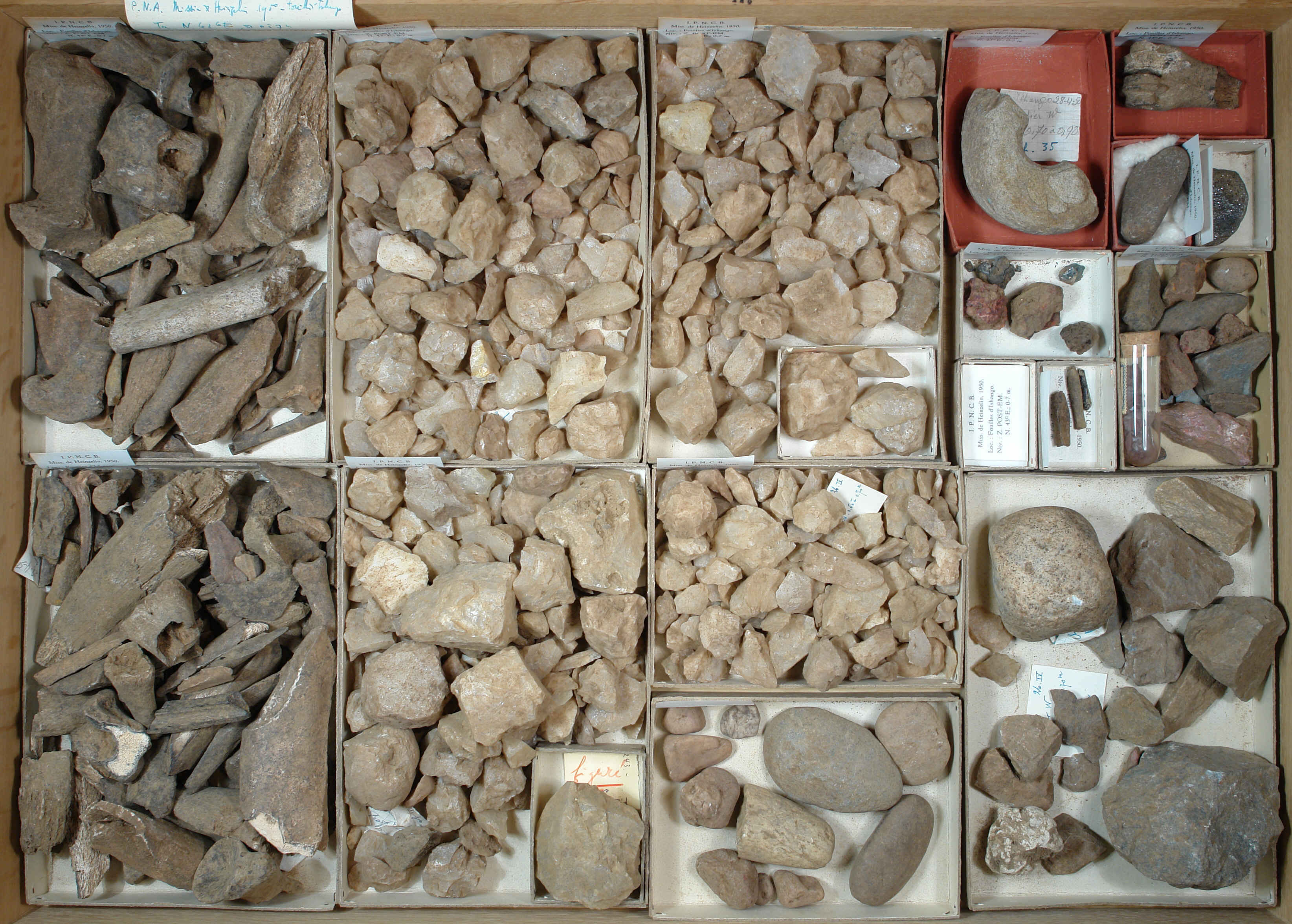 Mission de Heinzelin 1950 Industrie lithique et osseuse: 1 plateau. Fgts lithique Fgts osseux Fgts galet Pces taillées, pces polie