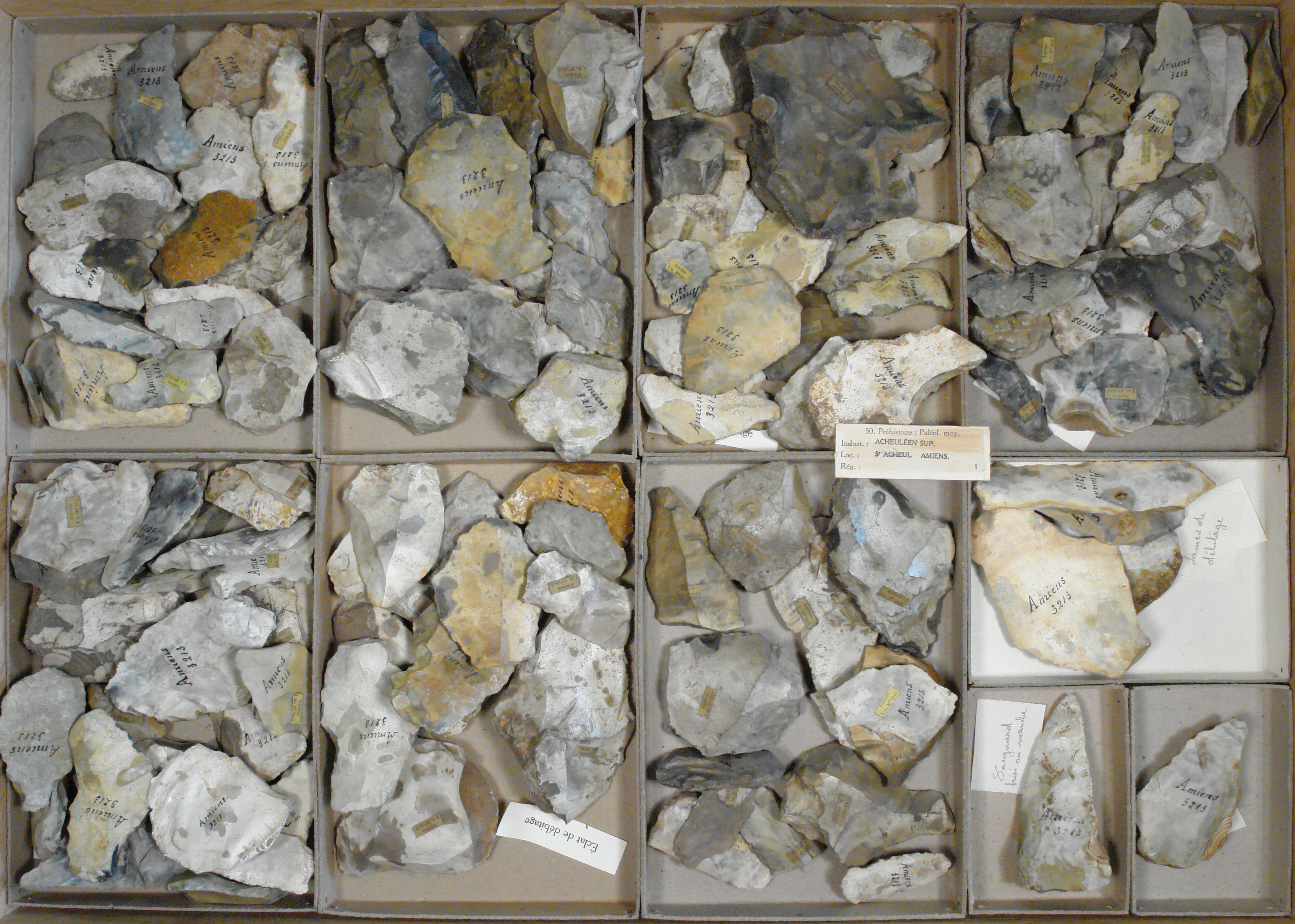 Acheuléen supérieur - éclats de débitage: 155 pcs, - lames de débitage: 5 pcs, - poignard brisé au manche: 1 pce, - racloir double: 1 pce.