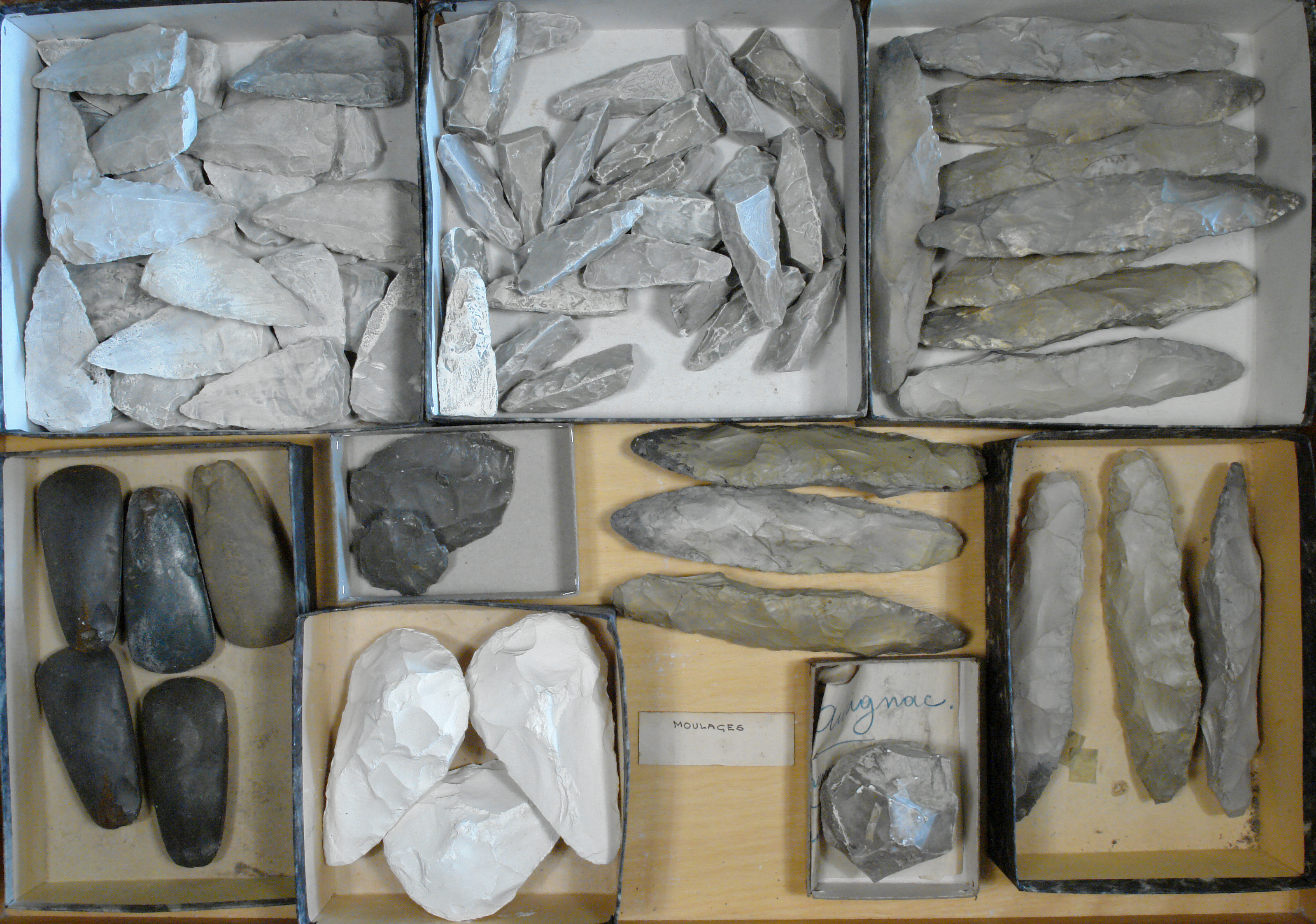 - moulages d'outils divers:  sans identification : bifaces, pointes Levallois, haches polies, pointes pédonculées et divers