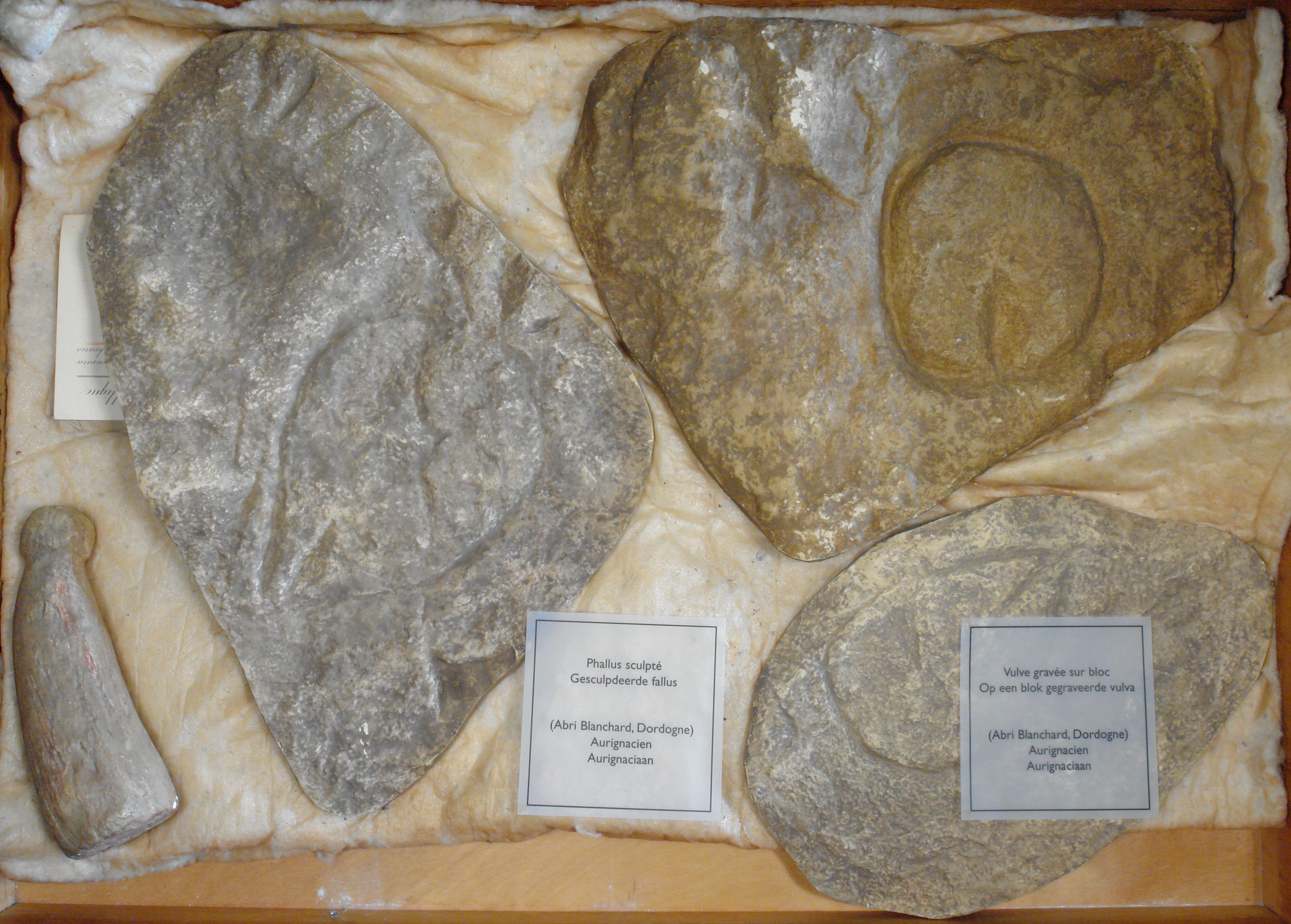 3 gravures de vulves sur pierre, 1 phallus ? ivoire, Aurign.