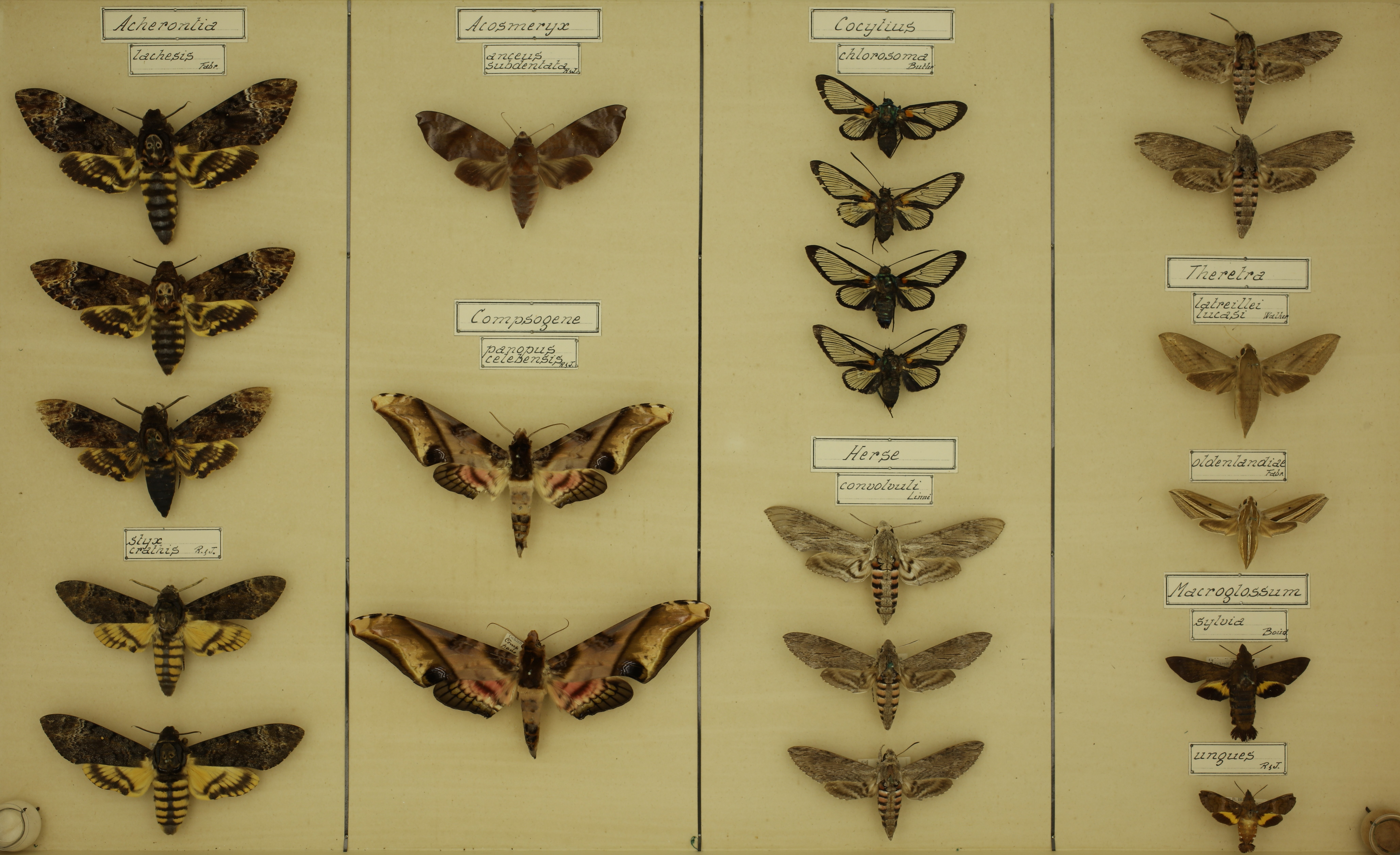 | Acherontia lachesis (Fabricius, 1798) | Lepidoptera | Sphingidae | Kandy (Ceylan); Bandoeng (Java) | 3 |