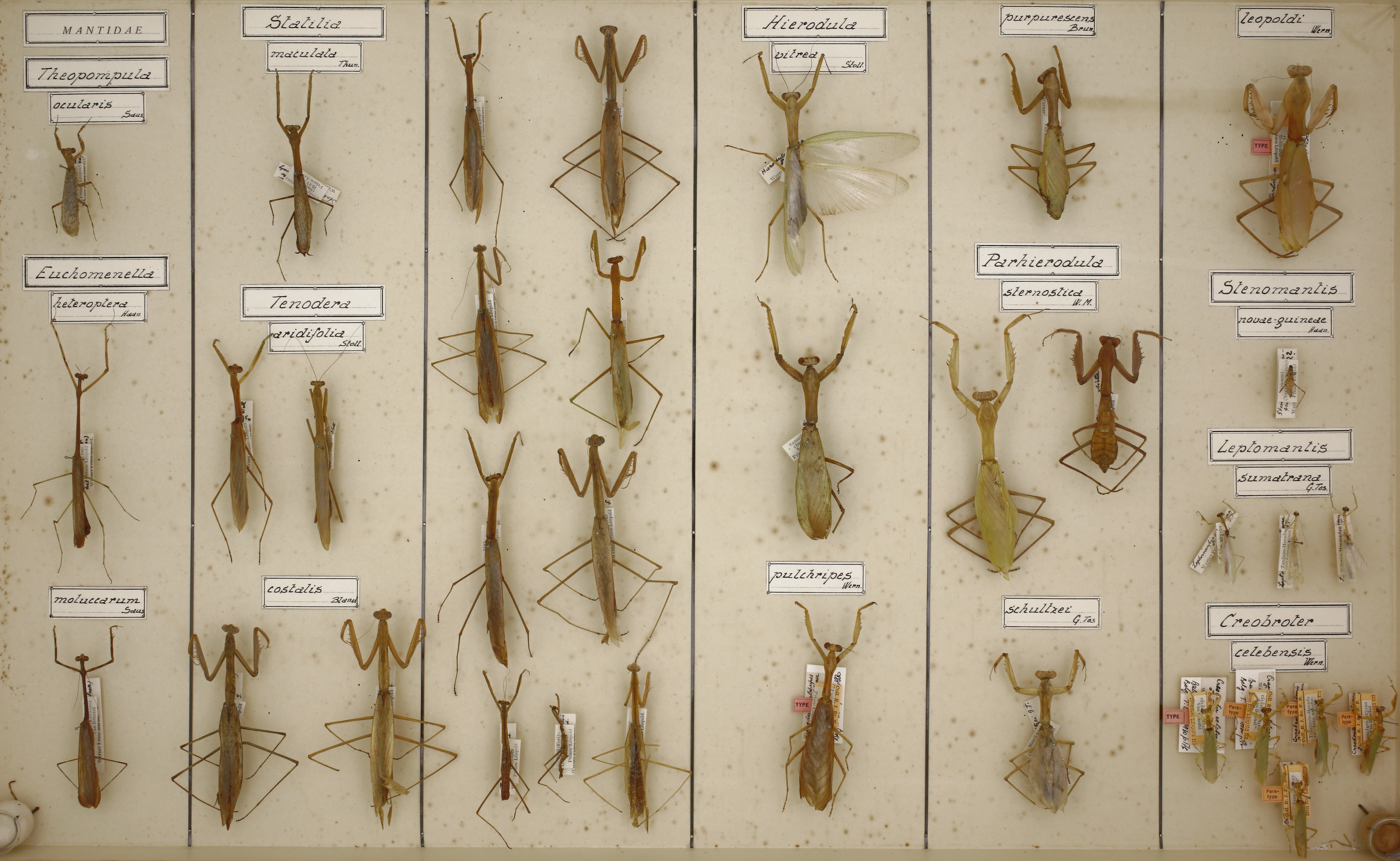 | Creobroter celebensis Werner, 1931 | Mantodea | Mantidae | Menado, Celebes; Tanggarie-Menado | 5 including 1 Type and 4 Paratypes | Type+Paratype |