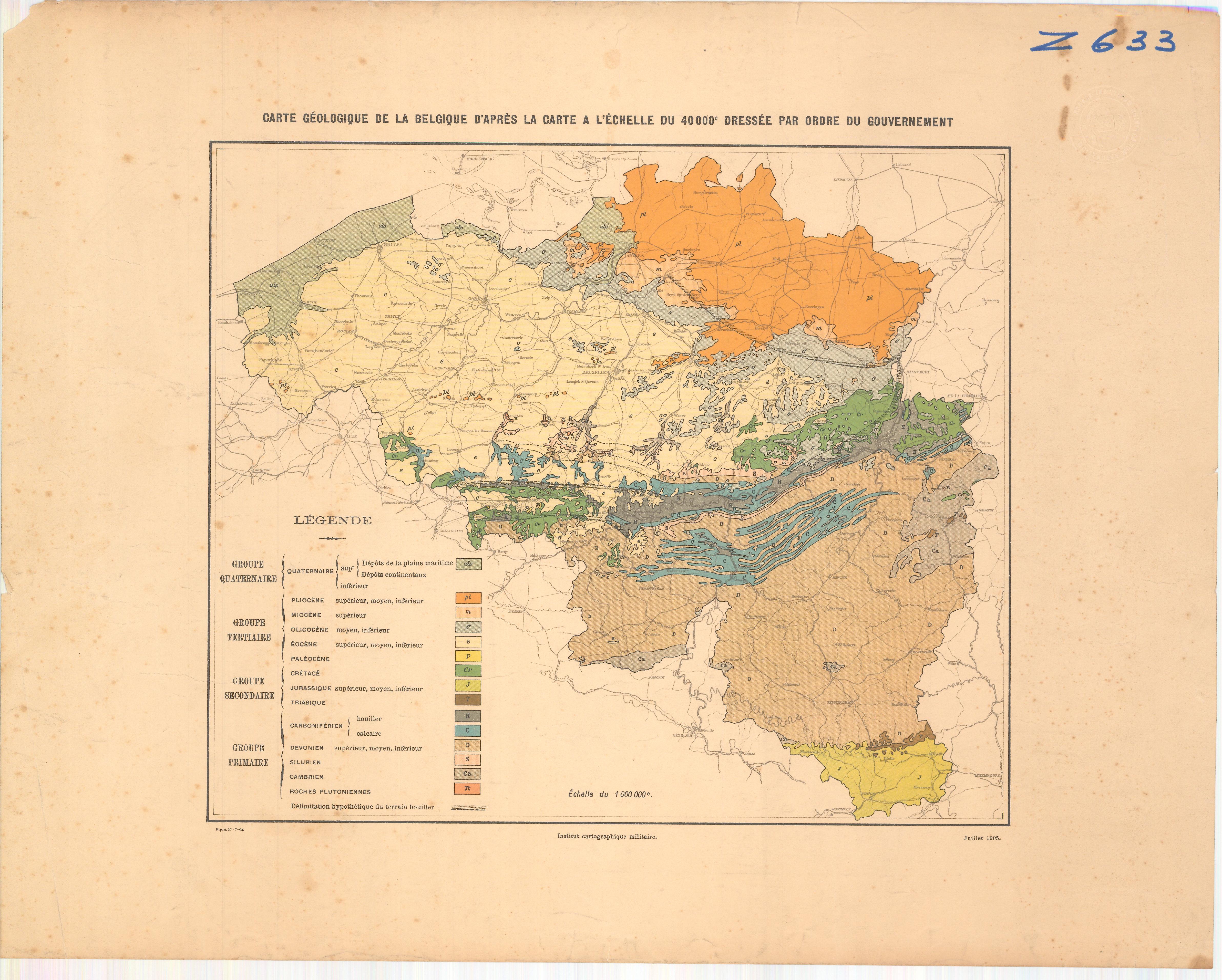 Carte géologique de la Belgique d'après la carte à l'échelle du 40000 éme, dréssée par ordre du gouvernement 1000k 1905