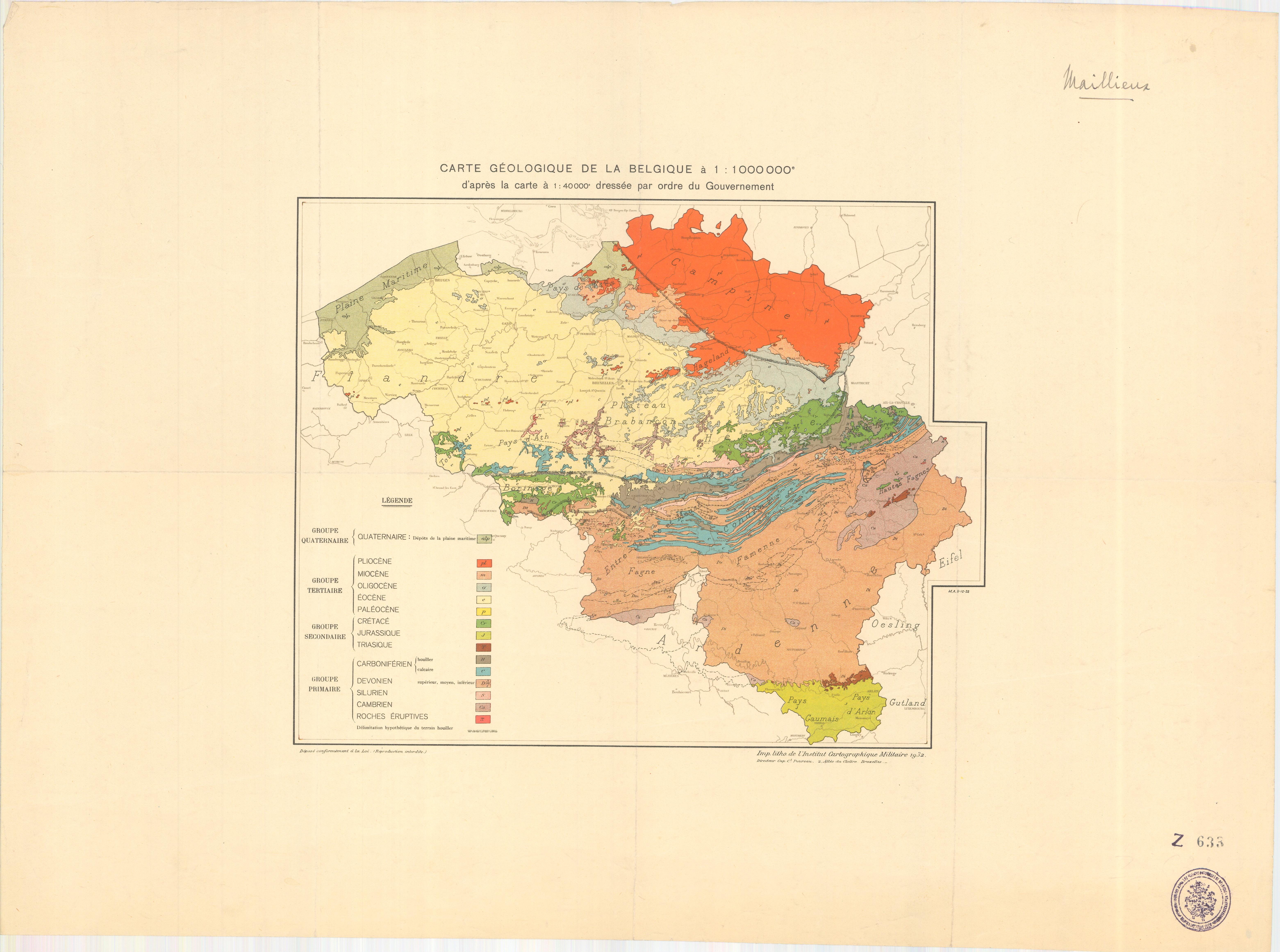 Carte géologique de la Belgique d'après la carte à l'échelle du 40000 éme, dréssée par ordre du gouvernement 1000k 1932